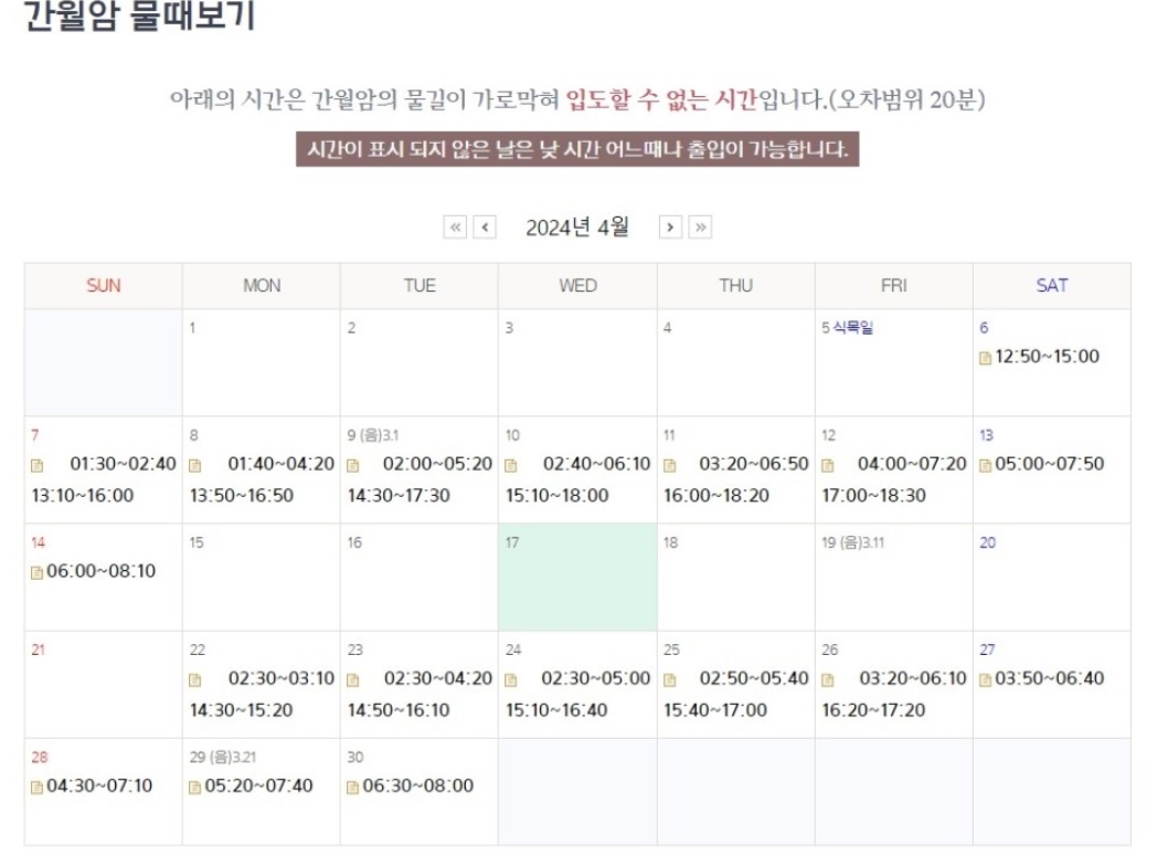 간월암은 서산의 해변가에 자리한 바위섬으로, 전체적으로는 사찰로 구성되어 있습니다. 이곳은 바닷길이 열려야만 안으로 들어갈 수 있는 특별한 장소입니다. 따라서 방문 전에는 간월암 물때 시간을 확인하는 것이 중요합니다. 예를 들어, 2024년 4월의 경우에는 17일부터 21일까지는 낮 시간 어느 때나 출입이 가능하지만, 그 외의 날에는 특정 시간대에만 출입이 허용됩니다.